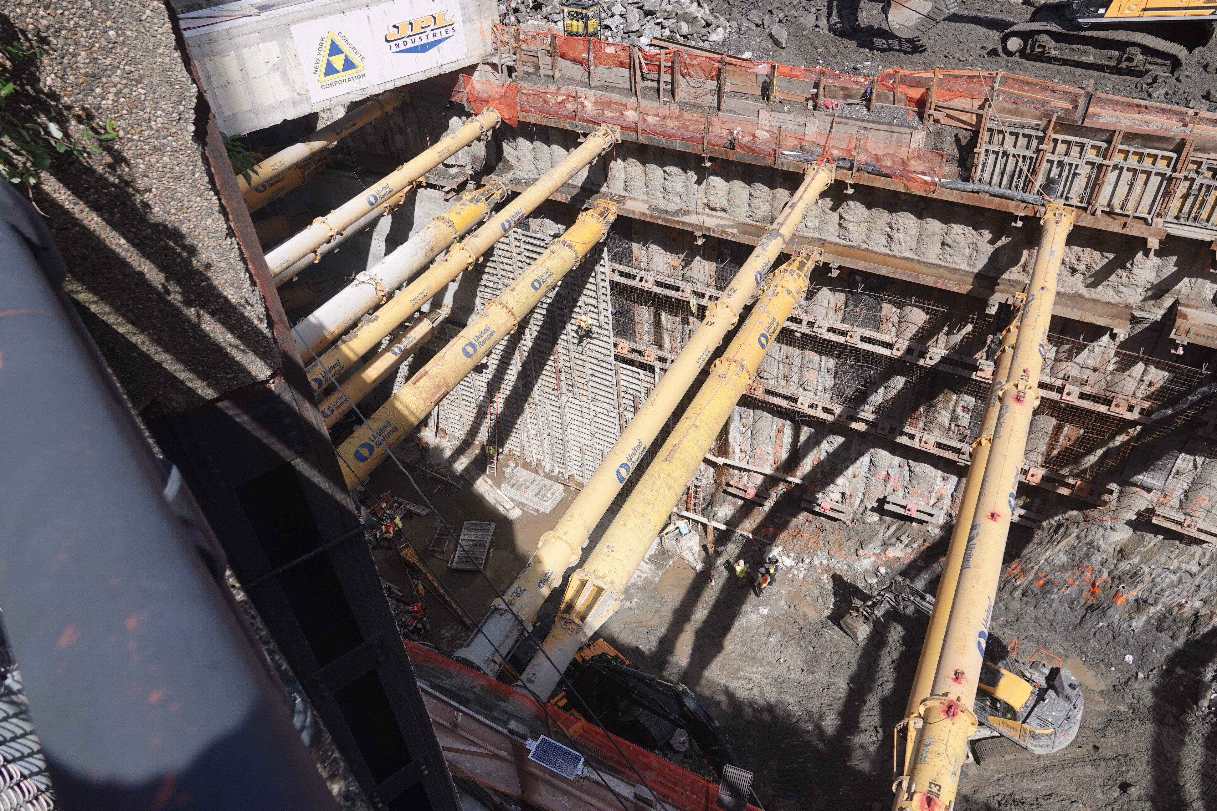 August 2025: The HYCC-3 team installs struts, tiebacks, and walers to hold up the walls of the trench during excavation and tunnel box construction.