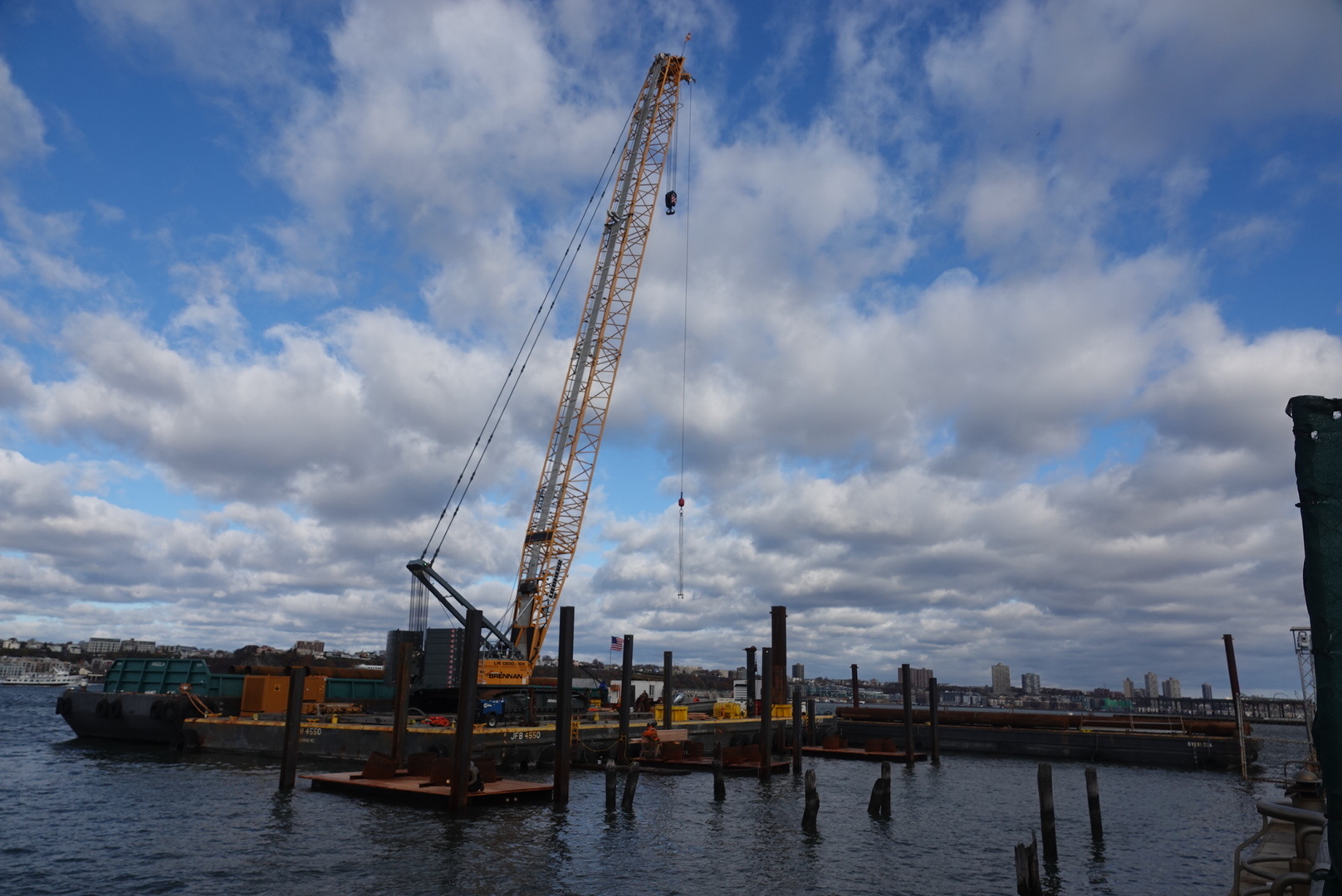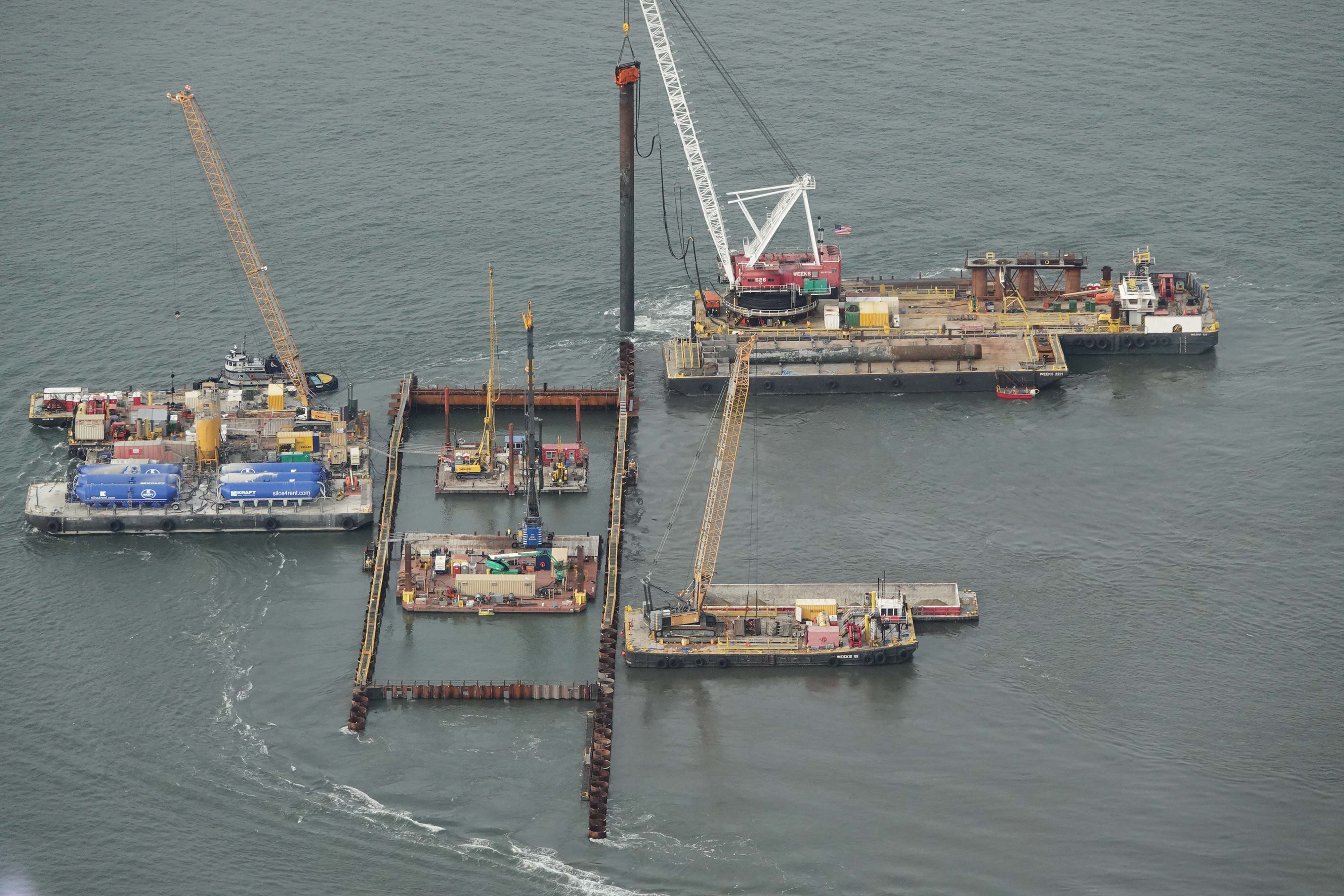• November 2025: A king pile is pulled from the western side of the cofferdam. It will be reinstalled on the eastern side to shift the enclosed area toward Manhattan.
