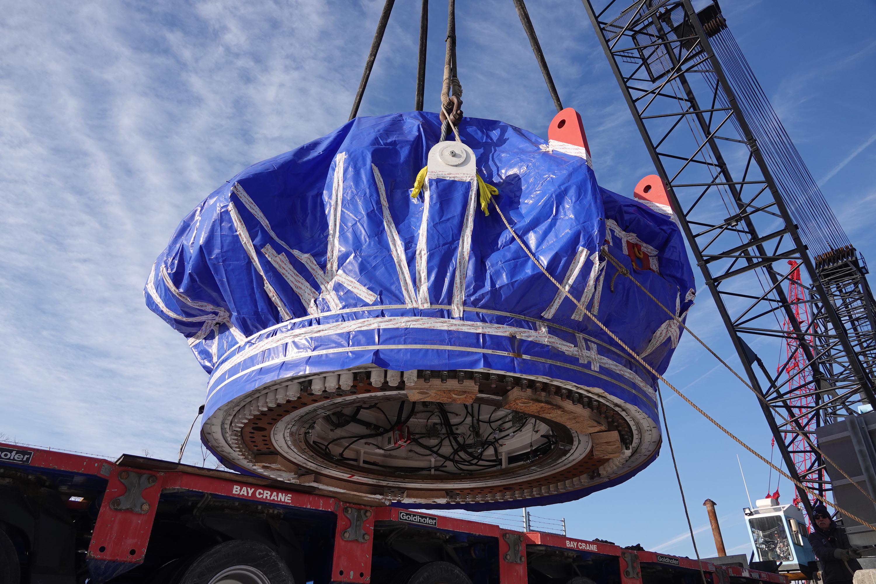 January 2026: The main drive unit for tunnel boring machine S-1431 is loaded onto a truck for delivery to the Tonnelle Avenue construction site.
